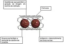 O grande destaque da nanotecnologia do carbono é proveniente das inúmeras aplicações que estão sendo desenvolvidas para as nanoestruturas do carbono. Na área de pesquisa e desenvolvimento de fármacos, fulerenos e NC podem ser utilizados para carregar substâncias bioativas até alvos específicos. Essas estruturas podem ser funcionalizadas com determinados grupos que facilitam a absorção de fármacos nos sistemas biológicos. Estudos recentes vêm mostrando a capacidade de NC em ligarem-se a proteínas de antígenos. Dessa forma, é possível o desenvolvimento de novas formas de vacinação. Outra utilidade na área farmacêutica seria a introdução de átomos metálicos no interior de fulerenos e NC, assim como a introdução de grupos funcionais em suas estruturas, que permitem a geração de imagens em exames de contraste (Figura 14).[14][15]