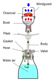 - Base (jarro ou vaso): peça central do narguilé; assemelha-se a um vaso. É onde se coloca a água (ou, embora não seja tradicional, com outros líquidos, como áraque, sucos ou essências naturais). Geralmente, é feita de vidro, acrílico, metal ou cerâmica; algumas são ornamentadas com desenhos.
