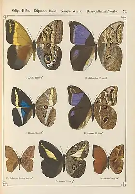 ![]() Ilustração do livro Exotische schmetterlinge / von Dr. O. Staudinger und Dr. E. Schatz com duas borboletas Narope nas extremidades inferiores da página: à esquerda Narope cyllastros, a espécie-tipo;[4] à direita N. anartes (aqui denominada N. sarastro). A borboleta entre ambas é uma Dasyophthalma creusa (todas: vista superior, esquerda; vista inferior, direita). | |||||||||||||||||
