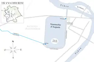 A Naumaquia de Augusto ficava localizada ou perto da igreja de San Cosimato in Trastevere, onde foram descobertos grandes blocos arredondados de travertino[6] entre a Viale del Trastevere e a antiga Via Campana Portuensis durante as obras de construção da primeira[7][8] ou para o sul da Via Aurélia e do canto sudeste da igreja de San Francesco a Ripa in Trastevere, onde foram encontrados muitos mosaicos em preto-e-branco do final do século I a.C. a cerca de oito metros de profundidade[9].