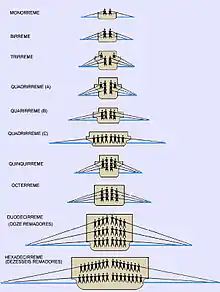 É através da etimologia utilizada que pode-se identificar as reais dimensões que devia ter a embarcação. Os navios da antiguidade helenística possuem sua classificação relacionada com o número de remadores dos patamares sobrepostos de cada bordo; consiste basicamente numa palavra composta por um prefixo-numeral e o sufixo "reme".