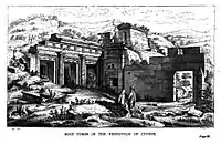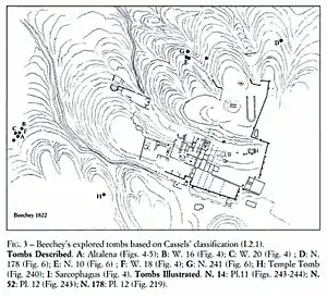 "Alguns sentimentos de melancolia devem ser despertados em cada visitante, conforme ele segue aquelas longas filas de sepulcros violados, espalhados ao longo das encostas das colinas, intrometendo-se na planície abaixo, e se estendendo em todas as direções através do planalto ao sul. O sarcófago simples e o mausoléu orgulhoso agora ficam escancarados sem inquilinos; não perpetuando nem a afeição dos sobreviventes nem os méritos dos mortos, estando mudos quanto à sua história, seu destino, e quase seus nomes. Mãos bárbaras perturbaram as relíquias e saquearam os tesouros que antes elas continham; a existência de tais tesouros deve ter sido o incentivo para, e só isso pode explicar a violação universal de túmulos — o ódio, se inútil, bem como laborioso, raramente é assim implacável.""A face norte da colina oriental parece ter sido o primeiro lugar usado para sepulturas; e, a julgar pelo estilo, devo pensar que alguns monumentos, a cerca de meia milha da fonte, na estrada para Apolônia, estão entre os mais antigos. São grandes sepulcros, com desbotamentos cortados na rocha sólida, com pórticos, de estilo grego, quase egípcio. Estou inclinado a pensar que os sepulcros, que são inteiramente escavados, sem quaisquer acessórios de alvenaria, são de duas épocas, a mais antiga e a mais recente, a primeira, embora geralmente rude, impressionante em sua vastidão monolítica; a última, em suas decorações meretricamente diminutas, embora graciosas, lembrando-me fortemente de Pompeia. Algumas dessas encontram-se, nas quais a rocha lisa é marcada com linhas, para imitar alvenaria, como as casas de estuque de Belgravia. "