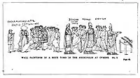 "O próximo grupo está, infelizmente, muito danificado, pois sua composição é notável. Contém oito figuras, todas coroadas de hera; o quarto soprando um chifre duplo; diante deles está uma figura nua com um peito quadrado. Aqui está um figura agora sem cabeça, e novamente o músico tocando a lira, rodeado por sete pessoas. Uma figura masculina, em uma máscara trágica, parece declamar para uma mulher também mascarada, que está rodeada por outras sete mulheres, coroadas com guirlandas. [...] em estilo, eles se parecem muito com muitos dos afrescos de Pompeia, aos quais, ou melhor, mais tarde, podem ser atribuídos. Em ambos os lados da porta, há uma luta de animais e uma caça. Em um, há um touro atacado por um leão, enquanto um tigre se prepara para saltar sobre seu pescoço; acima estão veados, uma gazela, cães e um chacal. Lanças estão voando por toda parte."