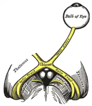 Os axônios dos neurônios ganglionares têm o seguinte comportamento: As fibras da retina nasal se cruzam em sua totalidade no quiasma e passam a formar o que chamamos de trato óptico ao lado oposto de sua origem. As fibras que se originam na retina temporal e as fibras musculares do mesmo lado não cruzam a linha média e passam pelo lado externo do quiasma óptico, aonde chegam para formar parte do trato óptico do mesmo lado, onde se juntam com as fibras da retina nasal oposta. As fibras do trato óptico por sua vez, fazem sinapse com os neurônios do corpo geniculado lateral.