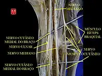| Nervos da extremidade superior esquerda. (O musculocutâneo está indicado na parte superior direita) | |
