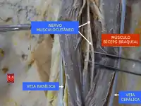 Quando se torna cutâneo, a nível do canal externo da dobradura do cotovelo, se coloca por dentro da veia cefálica mediana e se divide em dois ramos, um anterior e outro posterior.