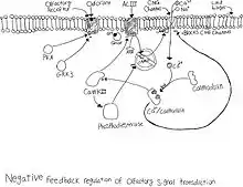 O feedback negativo de resposta após a despolarização neurônio olfatório tem um funcionamento rápido. Quando o neurônio é despolarizado, o canal de íons CNG é aberto, permitindo que a entrada de Sódio e Cálcio. O cálcio, agora em alta concentração na célula, inicia uma cascata de eventos que geram a dessensibilização do neurônio. Primeiro, o cálcio se liga à calmodulina para formar o complexo CaM. CaM vai, em seguida, se ligar ao canal (CNG) e fechá-lo, interrompendo a entrada de sódio e de cálcio.[10] A Proteína quinase dependente de calmodulina (CaMKII) será ativada pela presença de CaM, que vai fosforilar a adenilato ciclase II e reduzir a produção cAMP.[11] CaMKII irá também ativar a fosfodiesterase, que, em seguida, irá hidrolisar o cAMP presente na célula.[12] O efeito da resposta de feedback negativo diminui a sensibilidade do neurônio, necessitando uma maior quantidade de odorantes para sua ativação.