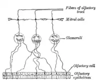 A principal função dos neurônios olfatórios é reconhecer moléculas, que tenham se dissolvido no muco, e sinalizar esse reconhecimento para neurônios de níveis hierárquicos superiores, como as células mitrais do bulbo olfatório. O reconhecimento dessas moléculas acontece através dos receptores olfatórios, localizados nas membranas dos cílios, que desencadeiam uma complexa cascata que leva a ativação de receptores ionotrópicos capazes de despolarizar o neurônio.[7] Os neurônios ativos realizam sinapses, nos glomérulos, com as células mitrais indicando a presença dos odorantes pelos quais aqueles neurônios são responsáveis.