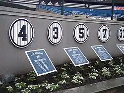 Os números foram apresentados atrás da cerca do velho Yankee Stadium à esquerda e na frente de bullpen da equipe adversária, formando uma pequena viela que liga o Monument Park aos carrinhos do campo. Quando a franquia atravessau a rua para para o novo estádio, os números foram incoporados no Monument Park, que fica no centro de campo entre os dois bullpens. Os 23 números foram colocados na parede, em ordem cronológica, começando com o número de Lou Gehrig 4. Este foi retirado logo após Gehrig deixar o beisebol em 4 de julho de 1939, no mesmo dia deu o seu famoso discurso de despedida. Seu número foi o primeiro aposentado na história da Major League Baseball.
