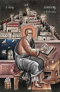 Nicolau Cabasilas foi arcebispo da Tessalônica por volta de 1354, e um firme apoiador dos cristãos ortodoxos em meio a controvérsia hesicasta, na qual tomou partido com São Gregório Palamas e os monges do Monte Atos contra Barlaão de Seminara.[6]