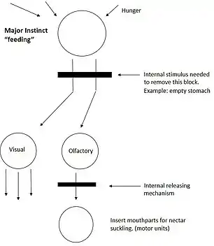 Um exemplo está em seus experimentos com abelhas forrageiras. Ele mostrou que as abelhas demonstram curiosidade por modelos de flores em papel amarelo e azul e sugeriu que esses estímulos visuais causavam o acúmulo de energia em um centro específico. No entanto, as abelhas raramente pousavam nas flores modelo, a menos que o odor adequado também fosse aplicado. Nesse caso, o estímulo químico do odor permitiu que o próximo elo da cadeia fosse liberado, estimulando a abelha a pousar. A etapa final foi a abelha inserir seu aparelho bucal na flor e iniciar a amamentação. Tinbergen imaginou isso como a conclusão do conjunto de reações para o comportamento de alimentação das abelhas.[4]