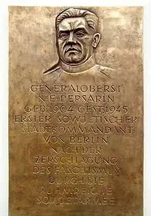 Durante a Batalha de Berlim, o 5º Exército de Choque de Berzarin alcançou a periferia oriental da capital alemã em 21 de abril de 1945, tornando-se o primeiro Exército Soviético a fazê-lo. Em 24 de abril, ele foi nomeado comandante da cidade pelo marechal Gueorgui Júkov. Pela "Ordem nº 1", em 28 de abril, Berzarin assumiu todo o poder governamental. Ele trabalhou para restabelecer a ordem na capital alemã, cidade que estava em ruínas, depois de anos de pesados bombardeios, criando uma força policial e fornecendo à população alimentos, água, gás e eletricidade, bem como reabrindo escolas e teatros.[1] Em 17 de maio, ele nomeou o apartidário Arthur Werner como primeiro prefeito de Berlim no pós-guerra.