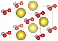 | Parâmetro de rede | a = 3.5653(8) Å,b = 5.5728(7) Å,c = 5.3846(13)[2] Å |
