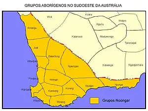 Os povos Noongar têm seis estações cujo período de tempo é definido por mudanças observáveis específicas no ambiente, com um período de seca variando de apenas três a onze meses. [6] [lower-alpha 2] As tribos estão espalhadas em três sistemas geológicos diferentes: