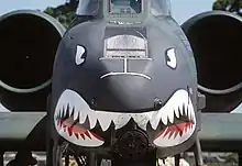 Similarmente, quando o 39.º Esquadrão de Caça se tornou o primeiro esquadrão americano em seu teatro com 100 mortes em 1943, eles adotaram a cara de tubarão para seus P-38 Lightning.[8] A cara de tubarão ainda é usada até hoje, mais comumente vista no A-10 Thunderbolt II (com sua boca aberta até o cano do canhão GAU-8 Avenger 30mm da aeronave), especialmente os do 23d Fighter Group (en), a unidade descendente do AVG e um testemunho de sua popularidade como uma forma de nose art.
