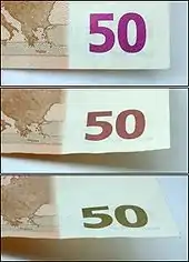 Tinta que muda de cor na nota - A constelação EURion:[1] a constelação EURion é um modelo de símbolos encontrados em um número de nota desenhados em todo o mundo desde 1996. É adicionado para ajudar um software a detectar a presença de uma nota em uma imagem digital;[1]