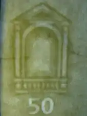 É a quarta menor nota, medindo 140x77mm, e tem por base um padrão de cores laranja.[4] As notas de cinquenta euros retratam pontes e arcos/portais em arquitetura renascentista (entre os séculos XV e XVI).