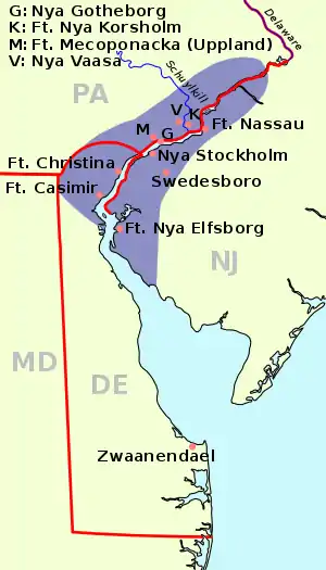 "New Sweden. This colony on the Delaware River included parts of the present states of Delaware, New Jersey, and Pennsylvania."