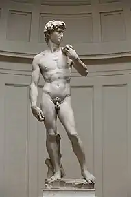 Uma das primeiras obras que cortavam com o passado e implicavam um retorno aos cânones clássicos foi o David de Donatello (circa 1440), obra de grande originalidade que se adiantou ao seu tempo, pois durante os seguintes cinquenta anos não houve realizações com as que podê-la comparar.[78] Com posterioridade a Donatello, o nu foi plasmado por artistas como Antonio Pollaiuolo, Botticelli e Luca Signorelli, com obras de grande dinamismo. Um classicismo mais sereno percebe-se na Itália central, como em Piero della Francesca, Perugino ou Rafael.[79] Por outro lado, Leonardo da Vinci afastou-se dos cânones clássicos, com figuras naturalistas concebidas segundo os seus amplos estudos de anatomia. A culminação do nu renascentista ocorreu na obra de Michelangelo, para o que o corpo humano nu tinha um caráter divino que lhe outorgava uma dignidade inigualável, em obras como o David (1501-1504), o Escravo moribundo (1513), A Criação de Adão (1508–1512) ou o Juízo Final (1536–1541).[80]