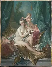 Entre Itália e França originou-se outra corrente denominada classicismo, igualmente realista mas com um conceito da realidade mais intelectual e idealizado, e onde a temática mitológica evocava um mundo de perfeição e harmonia, similar à Arcádia romana. Iniciou-se na Escola Bolonhesa, da família Carracci, destacando-se igualmente Guido Reni, Francesco Albani e Nicolas Poussin.[91] Espanha continuou sendo nesta época um país artisticamente casto e recatado, onde o nu via-se com olhos pudorosos, sendo predominantemente de tema religioso, como se percebe na obra de Francisco Ribalta, José de Ribera, Francisco de Zurbarán, Gregorio Fernández e Pedro de Mena. Algo mais de liberdade teve Diego Velázquez, sem dúvida pelo seu posto como pintor real, pelo qual do pôde efetuar mais nus que qualquer outro artista espanhol do seu tempo, destacando-se a Vênus ao espelho (1647-1651), um dos nus mais magníficos e afamados da história.[92]
