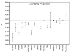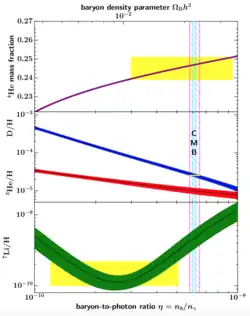Em que, a massa de Hélio é dividida pela massa total (massa de hélio mais hidrogênio (ou prótons)). Note que foi considerado uma aproximação na qual o 4He é quatro vezes "mais pesado" que o H; os prótons livres neste momento estão ligados ao 4He ou hidrogênio, a diferença de densidades entre essas duas partículas deve ser igual à densidade de hidrogênio . É previsto também que a razão em .[11][12][13] Portanto, a partir destas previsões, os modelos cosmológicos preveem aproximadamente que 1/4 da matéria bariônica neste período era composto por 4He.[14] Com o resfriamento do Universo este conteúdo de 4He irá mudar devido a produção de estrelas em aproximadamente 100 milhões de anos após o Big Bang.[15]