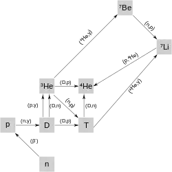 O elemento mais simples formado é o deutério, cujo núcleo atômico é composto por um próton e um nêutron. Na reação também são gerados fótons de radiação gama. Esta abundância de fótons altamente energéticos é muito maior que a de bárions e, por isso, o deutério sofre foto-dissociação em altas temperaturas, no caso quando [8] Assim a taxa de produção de deutério se torna maior que a de destruição, atingindo uma densidade considerável. Após um período muito curto devido à forte interação, virtualmente todos nêutrons vinculam-se ao deutério. O 3He, por sua vez, é formado a partir da captura de um próton pelo deutério, ou por meio de colisões envolvendo dois núcleos de deutério.