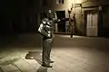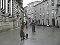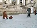 Em torno desta estátua central encontram-se quatro peças bidimensionais de aço Corten en forma de silhuetas ou sombras representando figuras populares de um mercado municipal na Idade Média tais como vendedoras com os seus cestos à sua frente ou comerciantes num determinado dia num mercado da cidade [3].