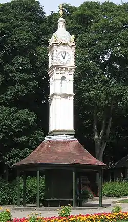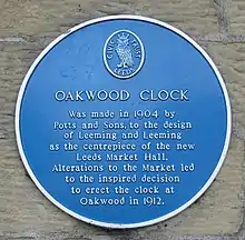 É a casa do Oakwood Clock, um grande relógio construído em 1904 por Potts and Sons para o desenho de Leeming and Leeming e situado na extremidade inferior de Roundhay Park; ele foi projetado pela primeira vez como a peça central do Mercado Kirkgate, em Leeds. Depois o projeto foi revisado e considerou-se que este relógio não seria mais adequado para a construção, e a ideia de colocá-lo em Oakwood surgiu. Oito anos depois foi construído pela primeira vez este relógio erguido em madeira de carvalho.[1]. O relógio foi restaurado pela última vez em 1970 e possui agora uma necessidade urgente de reparação. Diversos grupos locais organizaram uma série de eventos para angariar fundos na tentativa de levantar o dinheiro necessário para preservar este importante marco local.[2]