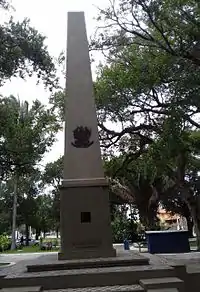 | Inscrições | Tem placas relativas ao centenário da cidade e da construção do monumento. Na meia altura do obelisco tem o Brasão de armas nacionais do Brasil em metal. |