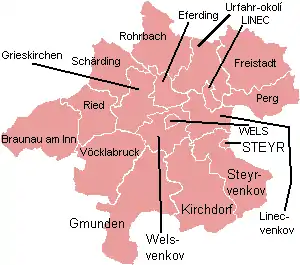 A Alta Áustria é tradicionalmente dividida em quatro regiões: Hausruckviertel, Innviertel, Mühlviertel e Traunviertel.