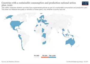 - Indicador 12.1.1: Número de países que incorporam o consumo e a produção sustentáveis em planos de ação nacionais ou como uma prioridade ou uma meta nas políticas nacionais.[11][12]