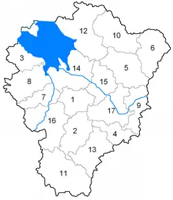 A disposição geográfica dos raiones do oblast de Iaroslavl (depois de nome de raion fica, entre parêntesis, nome de centro de raion respetivo): 1 - Bolchesselsky (Bolchoie Selo), 2 - Borissoglebsky (Borissoglebsky), 3 - Breitovsky (Breitovo), 4 - Gavrilov-Iamsky (Gavrilov-Iam), 5 - Danilovsky (Danilov), 6 - Liubimsky (Liubim), 7 - Michkinsky (Michkin), 8 - Nekouzsky (Novi Nekouz), 9 - Nekrassovsky (Nekrassovskoie), 10 - Pervomaissky (Prechistoie), 11 - Pereslavsky (Pereslavl-Zalessky), 12 - Pochekhonsky (Pochekhonie), 13 - Rostovsky (Rostov), 14 - Rybinsky (Rybinsk), 15 - Tutaevsky (Tutaev), 16 - Uglitchsky (Uglitch), Iaroslavsky (Iaroslavl). Notas: 1) as linhas curvas azuis são a parte do rio Volga; 2) a mancha azul é a parte da Albufeira de Rybinsk.