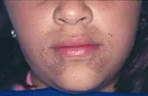 O pigmento fica espalhado por toda a pele, mas só se torna aparente em determinados locais onde a concentração é maior como articulações, bochechas, dedos da mãos e pés. Alguns dos sintomas possíveis são[6][7]: