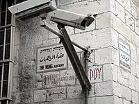 Israel, em sua monitorização capilar dos palestinos, foi chamado de um Estado de Vigilância por excelência.[250] Toda a população palestina está sob vigilância, independentemente de preocupações de inteligência, usando smartphones e câmeras de circuito fechado, algumas capazes de ver dentro de casas, cujas fotos são então alimentadas no sistema de rastreamento "Blue Wolf" das IDF, equipado com tecnologia de reconhecimento facial. Isso é uma versão simplificada do Wolf Pack, um banco de dados de computador que contém "perfis de praticamente todos os palestinos na Cisjordânia, incluindo fotografias de indivíduos, históricos familiares, educação e uma classificação de segurança para cada pessoa". A implantação de tais sistemas é proibida em Israel. Soldados das IDF em serviço em postos de controle na Cisjordânia não podem encerrar seus turnos até que tenham preenchido sua cota de 50 fotos de palestinos passando pelo posto de controle, juntamente com detalhes sobre eles. Os colonos têm um aplicativo de smartphone paralelo, White Wolf, para escanear palestinos. Drones e balões militares, bem como o invasivo spyware Pegasus para penetrar em smartphones, também fazem parte do sistema de vigilância na Cisjordânia.[251][252][253][lower-alpha 52]