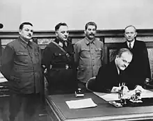 Durante a Segunda Guerra Mundial, a União Soviética anexou vários países como Repúblicas Socialistas Soviéticas, que originalmente foram efetivamente cedidos a ela pela Alemanha nazista em protocolos secretos do Pacto Molotov-Ribbentrop. Estes incluíram a Polônia Oriental (incorporadas em dois diferentes RSS),[6] Letônia (tornou-se RSS da Letônia),[7][8] a Estónia (tornou-se RSS da Estônia),[7][8] da Lituânia (tornou-se RSS da Lituânia),[7][8] parte da Finlândia Oriental (tornou-se RSS Carelo-Finlandesa) [9] e o leste da Romênia (tornou-se o RSS da Moldávia).[10][11]