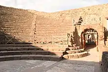 Em cada extremidade do palco, como no grande teatro ao lado, havia amplas entradas. Diferentemente do Grande Teatro ao lado, as altas paredes externas que sustentam os assentos não aproveitam qualquer declive de terreno, mesmo tendo a mesma altura das do outro teatro, e foram construídas diretamente a partir do chão. Isso diferencia sua construção da dos teatros helenísticos e prefigura o padrão arquitetônico dos teatros romanos posteriores.[8]