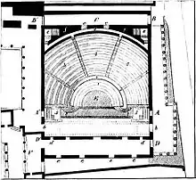 O Odeão é um teatro em miniatura que incorpora as três principais divisões de cávea, orquestra e o palco, assim como o Teatro de Pompéia. A fim de cobrir o espaço fechado por um telhado, as fileiras superiores de assentos foram reduzidas em comprimento e todo o edifício - cávea, orquestra e palco - foi reunido em uma forma oblonga; apenas a orquestra e as fileiras inferiores de assentos na caverna formam um semicírculo completo; o restante foi truncado pelas paredes externas. O espaço tinha capacidade para 1500 a 2000 pessoas.[5] Seu formato e materiais são os mesmos moldes encontrados em qualquer teatro romano; seus assentos eram de alvenaria cobertos com lajes de tufo. Eles tinham depressões nas costas e no topo para tornando a sessão mais confortável. Além da plataforma propriamente dita, medindo apenas cerca de 2,4m por 2,7m, três filas de assentos acima foram divididas pelo mesmo muro divisório.[6]