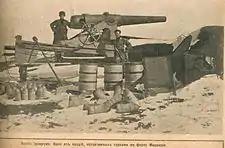 ![]() Tropas russas segurando os nove estandartes turcos capturados em Erzurum | |||