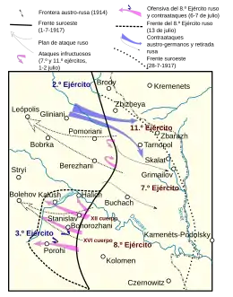 Encontrando pouca resistência por parte das tropas russas,[50] os soldados das Potências Centrais avançaram da Galícia e da Ucrânia até o rio Zbruch. As linhas russas foram ultrapassadas em 8 de julho, e no dia 11, os russos haviam retrocedido 240 km. Os ataques posteriores em outras zonas da frente de combate por parte das unidades russas foram inúteis.[60] Em 7 de julho, Kornilov havia obtido o controle de todas as tropas da frente sudeste graças ao seu desempenho no comando do 8º exército durante a ofensiva.[2]