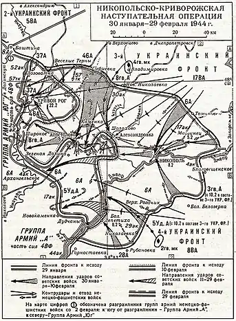 A 3ª Frente Ucraniana e elementos da 4ª Frente Ucraniana foram incumbidos em Janeiro de destruir as forças alemãs na área de Nikopol e Krivoi Rog, eliminando a cabeça de ponte de Nikopol e empurrando as tropas alemãs para trás da linha dos Inhulets e do Bug do Sul.[10] Em 29 de dezembro de 1943, o Marechal Sovetskogo Soyuza Aleksandr Vasilevsky, o representante do alto comando soviético, Stavka, relatou que a derrota das tropas alemãs se opôs à Primeira Frente Ucraniana na Ofensiva Zhitomir-Berdichev e ao redirecionamento da 2ª. Frente a um ataque a Kirovograd forçou uma reconsideração dos planos operacionais para as 3ª e 4ª Frentes Ucranianas. Ele concluiu que uma retirada alemã da cabeça de ponte de Nikopol era provável e, portanto, defendia um novo ataque entre 10 e 12 de janeiro de 1944.[12]
