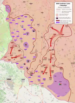 Ao fim de julho, após dois meses de violentos combates e bombardeios, o exército sírio declarou ter assumido praticamente o controle das províncias de Daraa e Quneitra, marcando mais uma vitória do regime Assad contra os rebeldes no sul.[6]