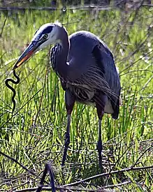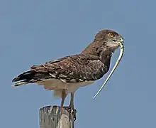 Embora muitas aves ocasionalmente se alimentem de serpentes, as espécies verdadeiramente especializadas são raras: todas pertencem ao grupo das aves de rapina. Especificamente, as aves do gênero Circaetus e as espécies Herpetotheres cachinnans e Terathopius ecaudatus são classificadas como ofiófagas especializadas.[5] Em algumas regiões, por exemplo, as serpentes podem representar mais de 95% da dieta da águia-cobreira, seja em peso ou em número de presas.[6]