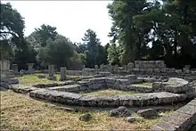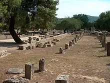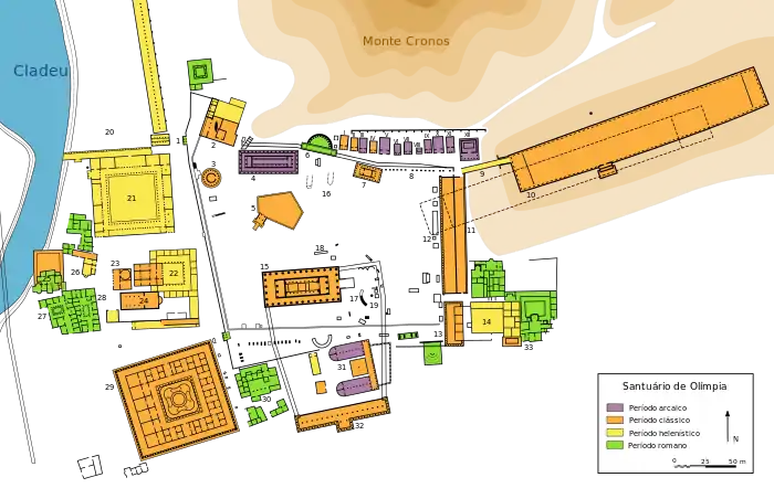 1: Propileu – 2: Pritaneu. – 3: Filipeu – 4: Templo de Hera – 5: Pelópio – 6: Ninfeu de Hérodes Ático – 7: Metroão – 8: Zanes – 9: Cripta – 10: Estádio – 11: Estoa Eco – 12: Edifício de Ptolomeu II e Arsínoe – 13: Estoa de Héstia – 14: Edifício helenístico – 15: Templo de Zeus – 16: Altar de Zeus – 17: Ex-voto dos Aqueus – 18: Ex-voto de Micitos – 19: Nice de Peônio – 20: Ginásio – 21: Palestra – 22: Teocoleão – 23: Heroão – 24: Ateliê de Fídias e Basílica paleocristã – 25: Banhos de Cládeos – 26: Banhos gregas – 27 e 28: Hospedarias – 29: Leonideu – 30: Banhos sul – 31: Buleutério – 32: Estoa sul – 33: Villa de Nero Tesouros I: Sicião – II: Siracusa – III: Epidamno ? – IV: Bizâncio ? – V: Síbaris ? – VI: Cirene ? – VII: ? – VIII: Altar ? – IX: Selinunte – X: Metaponto – XI: Mégara – XII: Gela