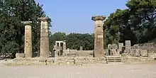 O Templo de Zeus em Olímpia (ou Olympieum) era o centro religioso do local e foi construído entre 470 e 456 a.C. pelo arquiteto Libon de Élis. Foi construído na ordem dórica e tinha seis colunas frontais e treze de cada lado, e única entrada era na fachada oriental, à qual se tinha acesso por uma grande rampa. Os grupos escultóricos dos pedimentos, considerados hoje a obra-prima do estilo Severo, esculpidos pelo Mestre de Olímpia, mostravam a corrida de bigas entre Pélops, criador dos Jogos Olímpicos, e Enômao, rei de Pisa, e as métopas estavam decoradas com as cenas dos "doze trabalhos de Hércules".