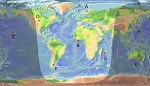 - Estação F (Golfo Nuevo, Trelew, Argentina) — Esta estação situava-se em Golfo Nuevo (}), a cerca de 40 km de Trelew, Argentina. Utilizava como antena um mastro de aço, electricamente isolado da terra, com 366 metros de altura, a mais alta estrutura jamais construída na América do Sul. O mastro foi demolido, por explosivos, a 23 de junho de 1998.