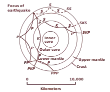 Para o estudo do interior do planeta faz-se uso das ondas P e S produzidas pelos terremotos, uma vez que estas se deslocam de forma diferente nos vários tipos de material.