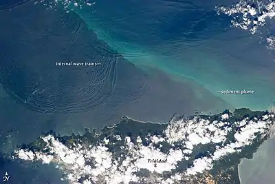 As ondulações da termoclina oceânica podem ser visualizadas por satélite porque as ondas aumentam a rugosidade da superfície onde o fluxo horizontal converge, e isso aumenta a dispersão da luz solar (como na imagem no topo desta página mostrando ondas geradas pelo fluxo de maré através da Estreito de Gibraltar).