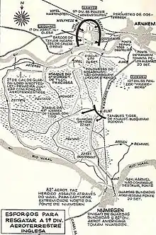 No canto mais distante das operações paraquedistas aliadas em Arnhem, a 1ª Divisão Aerotransportada britânica encontrou forte resistência dos defensores alemães. O atraso dos Aliados em capturar as pontes, particularmente em Son e Nijmegen, deu tempo para o exército alemão organizar suas linhas de defesa e mobilizarem mais homens e tanques e logo planejaram um contra-ataque. Na subsequente Batalha de Arnhem, os paraquedistas britânicos conseguiram conquistar o norte da cidade mas quando os reforços terrestres atrasaram, eles acabaram sendo sobrepujados pelos alemães a 21 de setembro. O que sobrou da 1ª Divisão Aerotransportada ficou presa em um pequeno bolsão a oeste da ponte da cidade, sendo evacuados apenas no dia 25.[10]