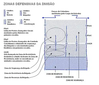 - A zona de segurança, estende-se para a frente e flancos da zona de resistência. As forças que aí actuam fornecem informações sobre o inimigo, criam dificuldades às acções de reconhecimento por parte do inimigo e retardam, desgastam, desorganizam e canalizam e induzem o inimigo em erro. Normalmente, as forças que actuam nesta zona incluem unidades de reconhecimento.