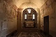 Na luneta sobre o portal da entrada está um afresco, "Juízo Final", com Cristo juiz, Maria, São João, apóstolos e dois anjos. O interior do oratório é retangular coberto por uma abóbada de berço decorada com estrelas e cruzes; no centro estão colocadas cinco majólicas originais formando uma cruz grega; o pisto é um trabalho em cosmatesco. Na base da abóbada está um friso com motivos florais.
